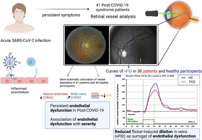 Das Auge als Fenster zu Long-Covid COVID Info, 2. August 20233. März 2024 Diese Studie zeigt die endotheliale Dysfunktion bei Long-Covid, bei Menschen nach überwiegend milden Infektionen. Die Veränderungen waren bei Erfüllen der Kanadischen Konsenskriterien (CCC) für ME/CFS besonders deutlich. »Anhaltende endotheliale Dysfunktion beim Post-COVID-19-Syndrom (PCS) und ihr Zusammenhang mit dem Schweregrad der Symptome und chronischer Entzündung« Das Verständnis der Pathophysiologie des PCS ist eine Priorität für die öffentliche Gesundheit, da es für Ärzte nach wie vor eine diagnostische und therapeutische Herausforderung darstellt.In dieser prospektiven Kohortenbeobachtungsstudie wurde die retinale Mikrozirkulation mit Hilfe der Retinalen Gefäßanalyse (RVA) in einer Kohorte von Patienten mit PCS analysiert […] Diese Ergebnisse machen deutlich, wie wichtig es ist, die retinalen Gefäßdurchmesser und die durch Flickerlicht induzierte Dilatation als potenzielle Biomarker für diese Erkrankungen weiter zu untersuchen, was zur Entwicklung neuer Diagnose- und Behandlungsstrategien für Patienten mit PCS und verwandten Erkrankungen beitragen könnte. Die Ergebnisse zeigen, dass eine anhaltende endotheliale Dysfunktion ein Kennzeichen des PCS ist, und Beeinträchtigungen der Mikrozirkulation scheinen die anhaltenden Symptome der Patienten zu erklären. Mit der Entwicklung potenzieller Therapien für PCS könnten Parameter der Retinalen Gefäßanalyse als klinische Biomarker für die Diagnose und das Therapiemanagement relevant werden. Persistent endothelial dysfunction in post-COVID-19 syndrome and its associations with symptom severity and chronic inflammation – AngiogenesisBackground Post-COVID-19 syndrome (PCS) is a lingering disease with ongoing symptoms such as fatigue and cognitive impairment resulting in a high impact on the daily life of patients. Understanding the pathophysiology of PCS is a public health priority, as it still poses a diagnostic and treatment c…Weiterlesenlink.springer.com Zusammenfassung Inhalt von X anzeigen Hier klicken, um den Inhalt von X anzuzeigen. Erfahren Sie mehr in der Datenschutzerklärung von X. Inhalt von X immer anzeigen Forschung AugenEndothelLong-Covid